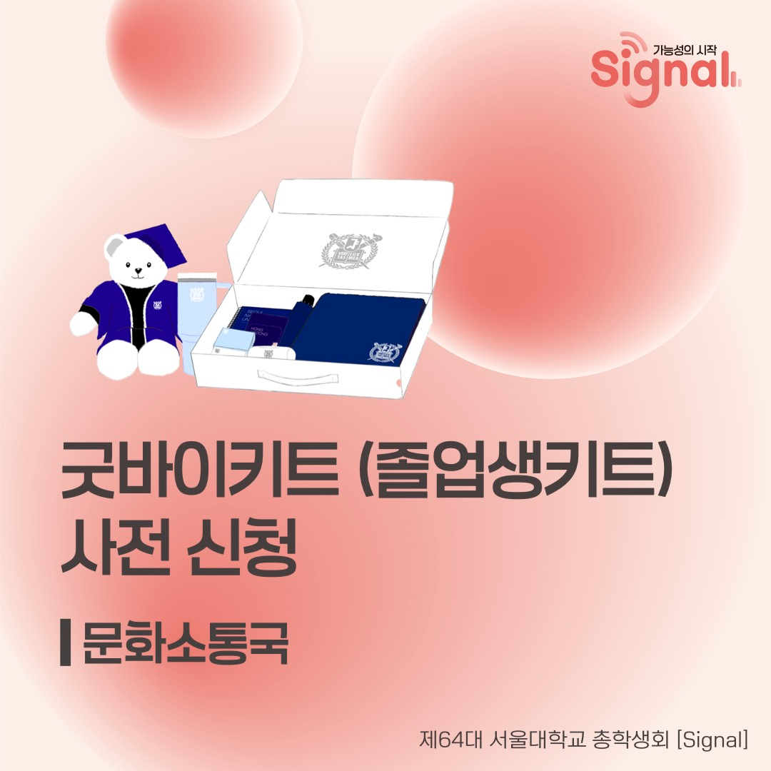 문화소통국 굿바이 키트(졸업생 키트) 사전신청[굿바이 키트(졸업생 키트) 사전신청] 안녕하십니까, 제64대 서울대학교 총학생회 [Signal] 중앙집행위원회 문화소통국입니다. 졸업하는 학우들이 학교를 추억할 수 있도록, 생활협동조합과 협업하여 굿바이키트(졸업생 키트)를 제작하였습니다. 동문 기업 협찬품과 함께 약 4만 원 상당의 구성을 무려 8천 원대에 받아보실 수 있으니, 많은 관심 부탁드립니다. 🧸 신청 기간 : 7월 21일(월) 21:00 ~ 7월 25일(금) 23:59 🧸 신청 링크 : bit.ly/굿바이키트 🧸 참여 대상 : 2025학년도 후기 졸업자 (학부) 🧸 수령 일정 : 2025학년도 후기 학위수여식 (8월 28일) 🧸 수령 장소 : 학생회관 📍1인 1개 구매이며, 400개 선착순 판매입니다. 📍선착순 구매는 ❗21일(월) 21:00❗부터 시작됩니다. 📍키트 구성 및 가격 상세 내용은 카드뉴스 참고 바랍니다. [문의 및 게시물 담당자 : 문화소통부국장 김보나]